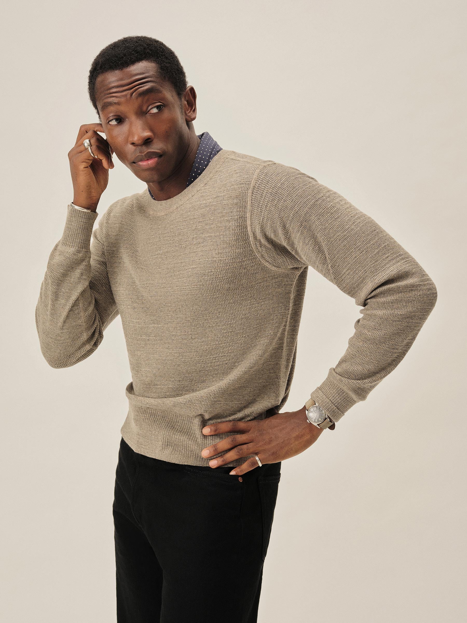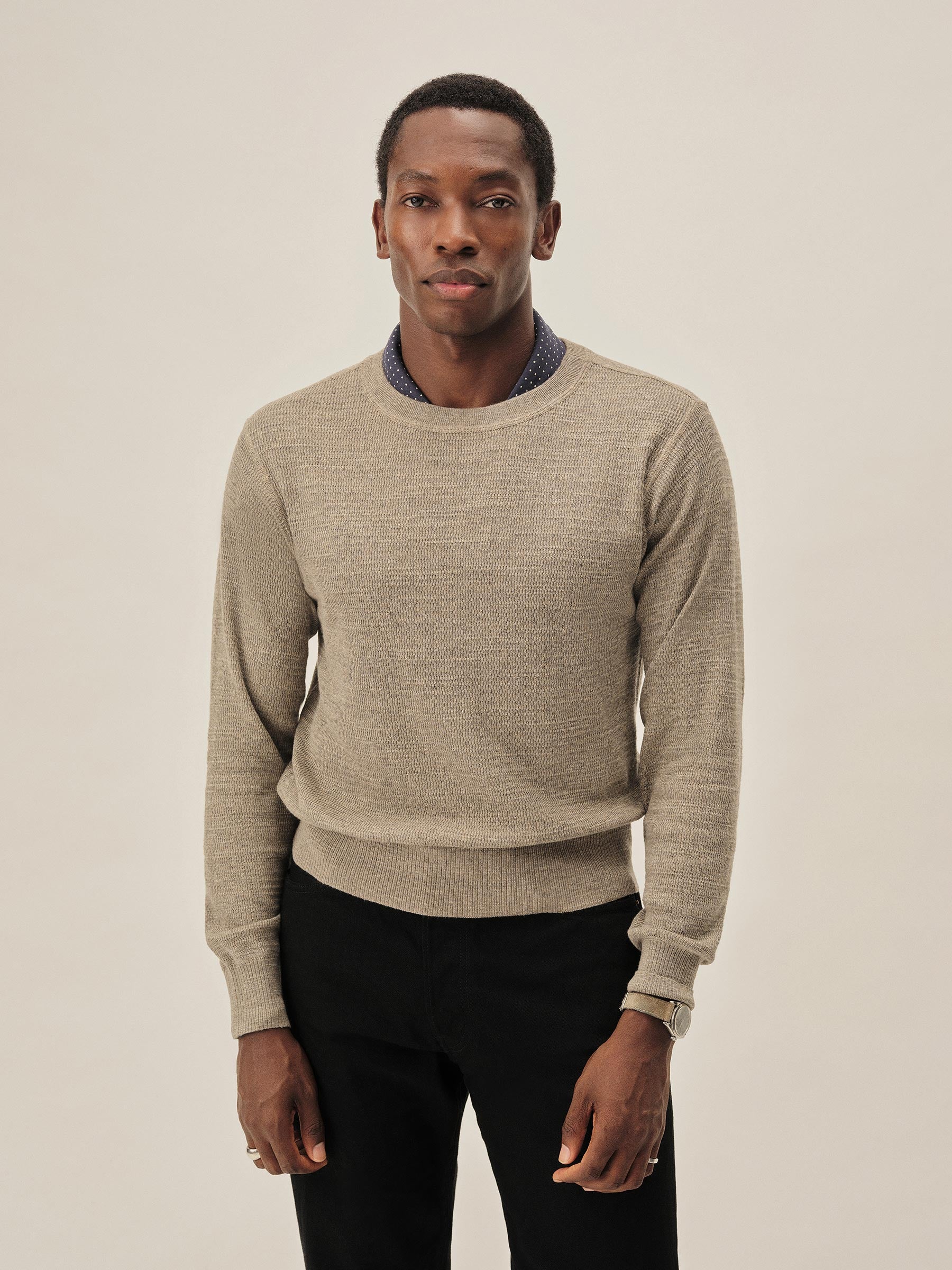 Inspired by WWII-era cut-and-sew thermals, this lightweight crew is knit from 100% slub cotton in a thermal stitch for breathable texture and vintage character. It’s finished with ribbing at the neck, cuffs, and hem, and yarn-dyed and garment-rinsed for a soft hand and broken-in feel.