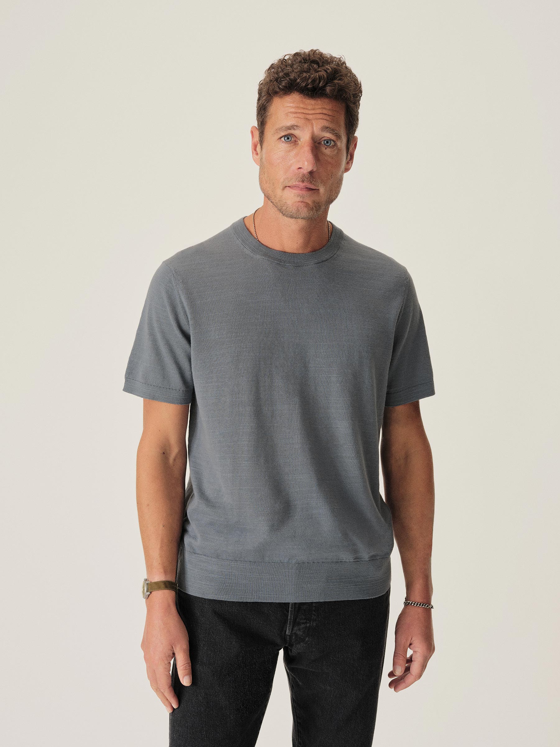 Classic fit short sleeve sweater tee with a straight hem. Yarn-dyed 16 gauge cotton jersey features light slub texture. Features double layer 1×1 ribbing at the collar and rib finishing at the cuffs and hem. Constructed with hand-linked seams for improved durability.
