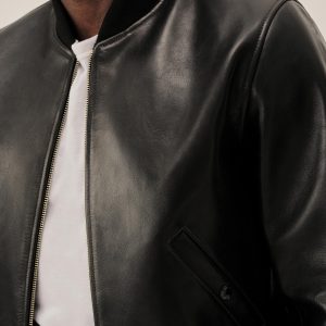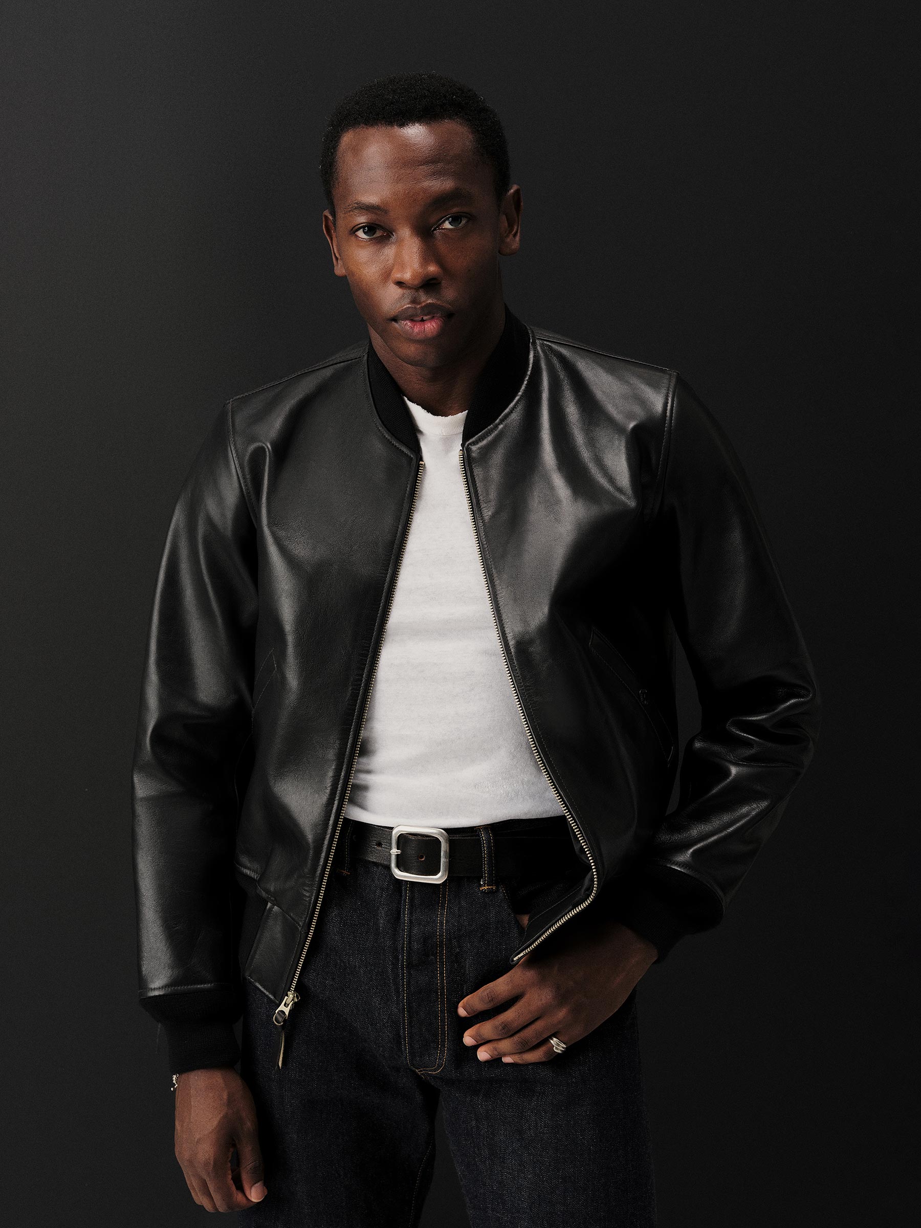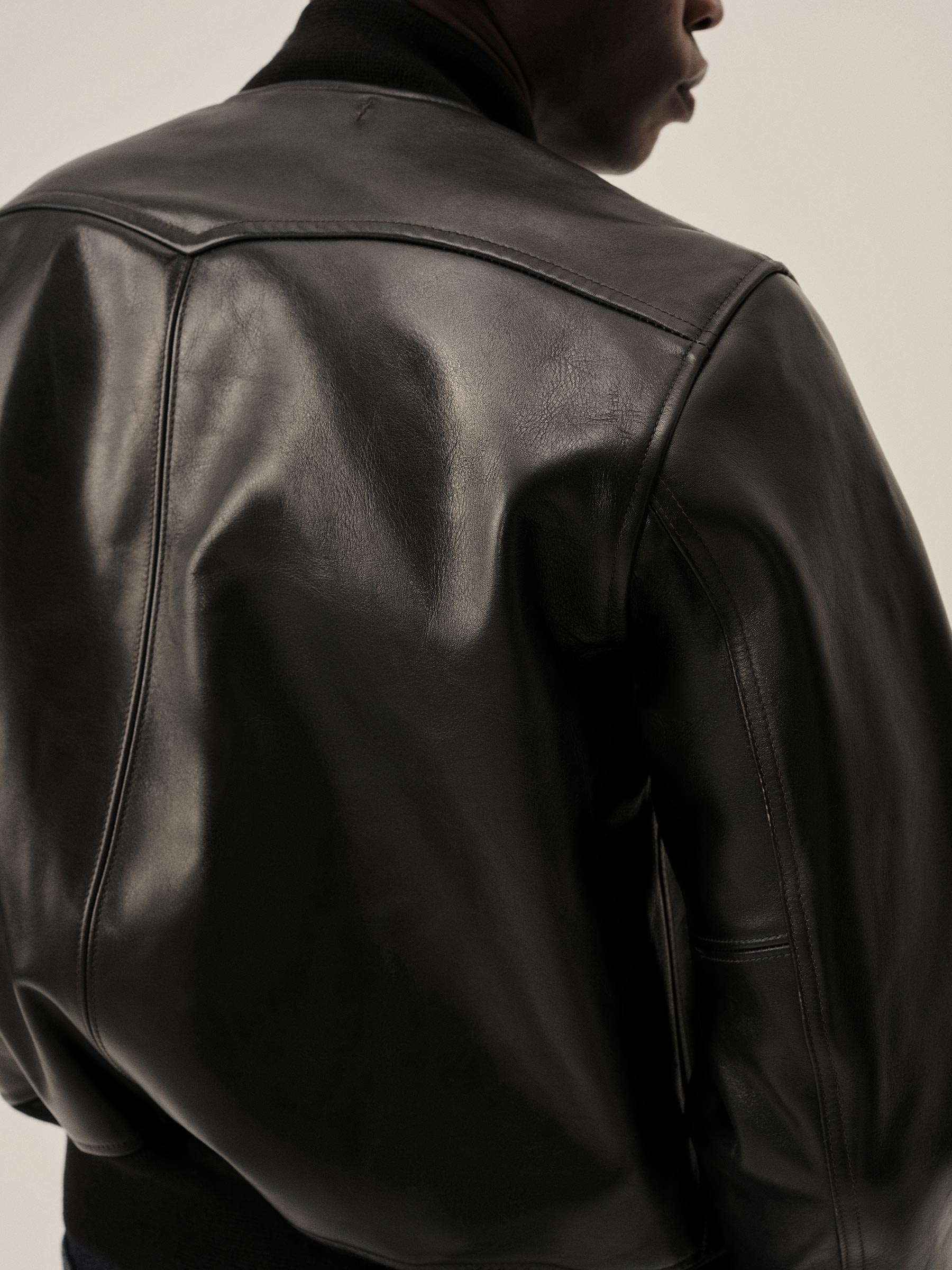 Vintage fit hand-cut bomber jacket in semi-vegetable tanned sheepskin. Two-stage dye process: first, the leather crust is dyed, then a second top dye is applied for a more natural patina. Details include angled zip pockets at the hips and cotton/wool ribbed cuffs and waistband with racking stitch detail. Features Bemberg™ lining. Garment washed, waxed, and hand-burnished for a lived-in feel.