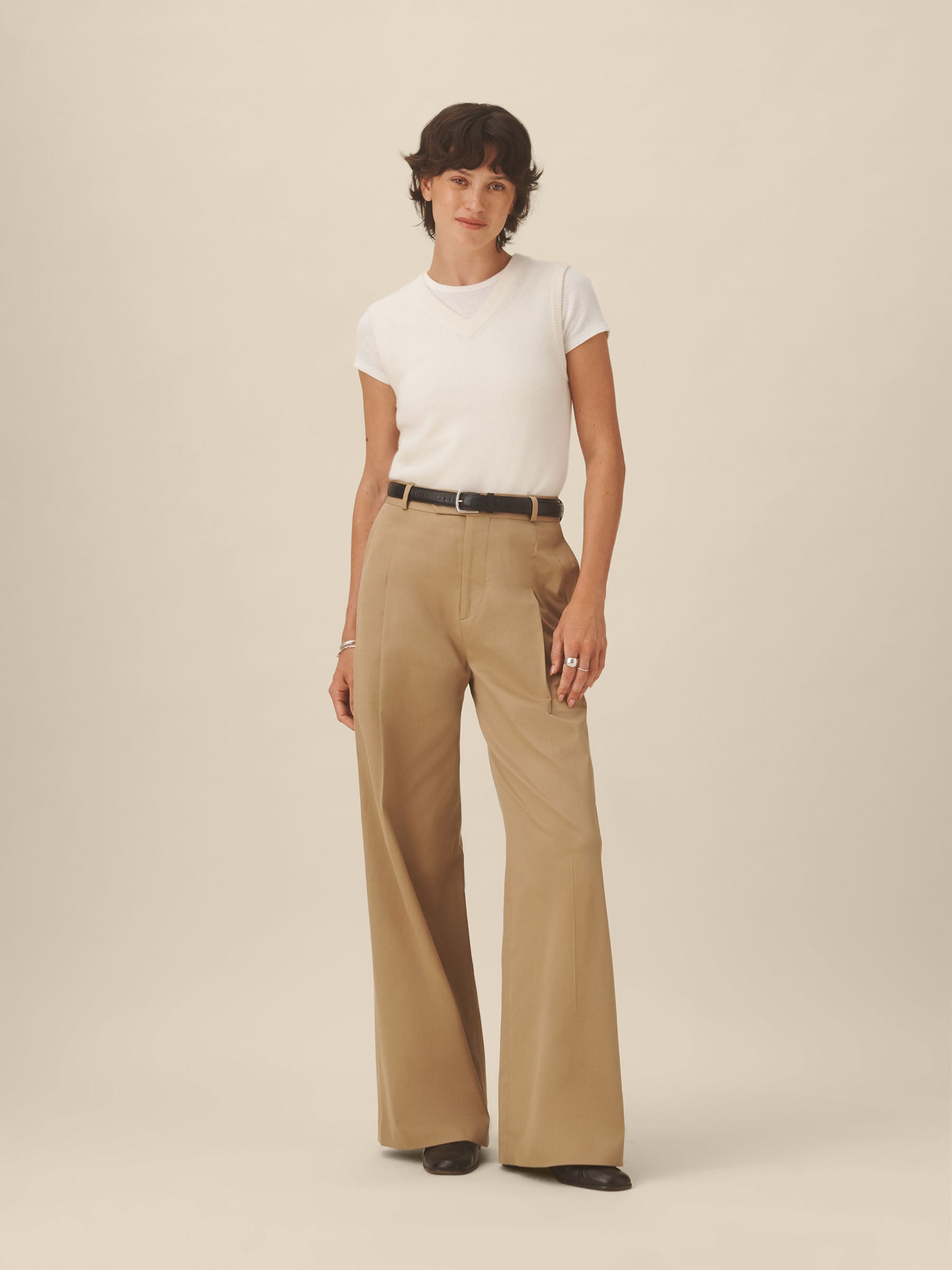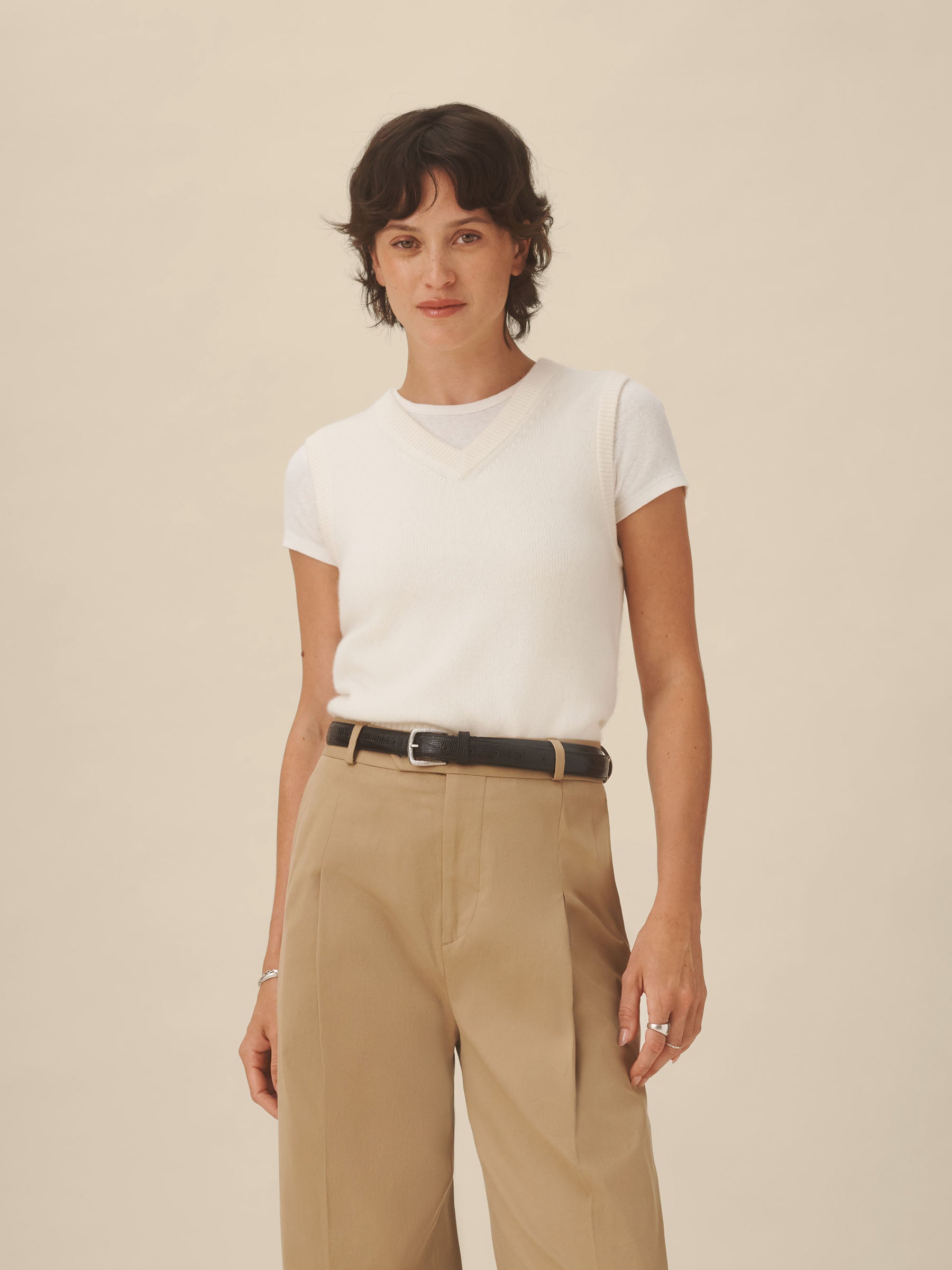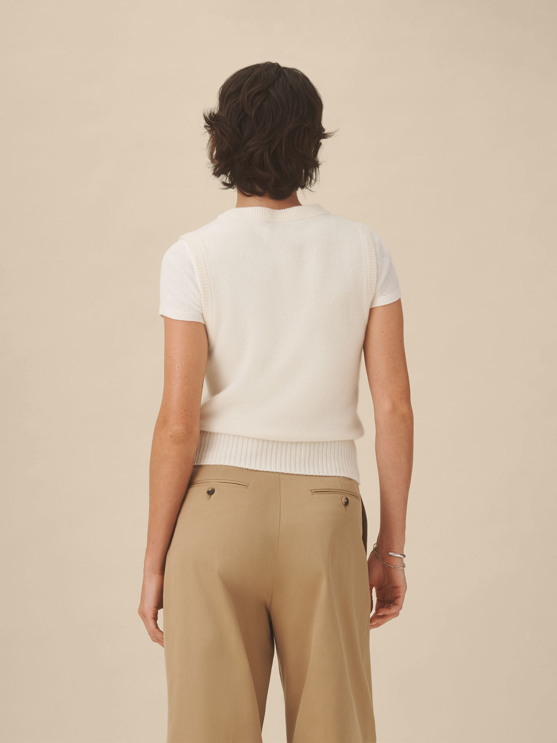 Inspired by vintage military knits, this sleeveless sweater is crafted from 100% cashmere with an airy, soft hand and clean jersey stitch throughout. Finished with rib trims at the neckline, armholes, and bottom band.