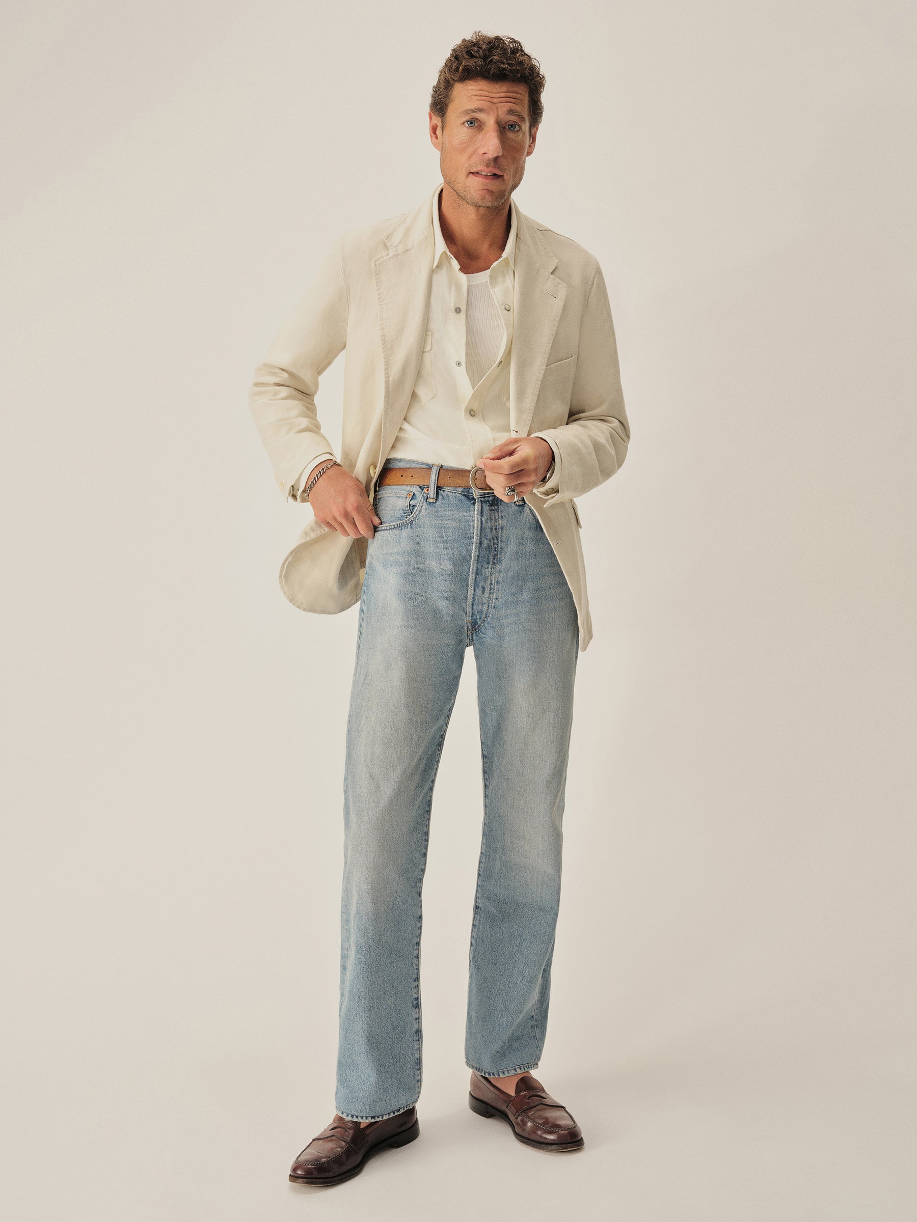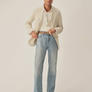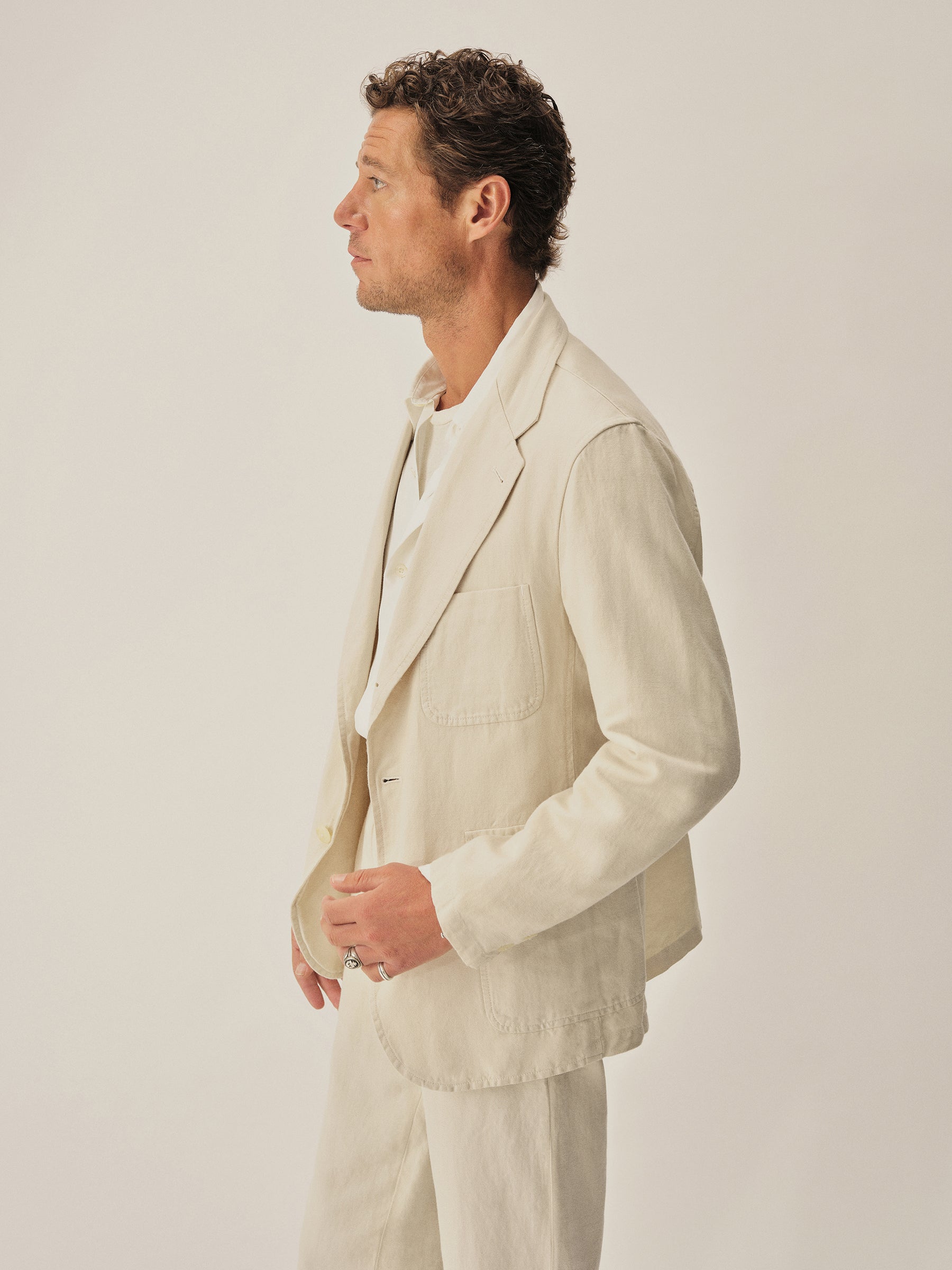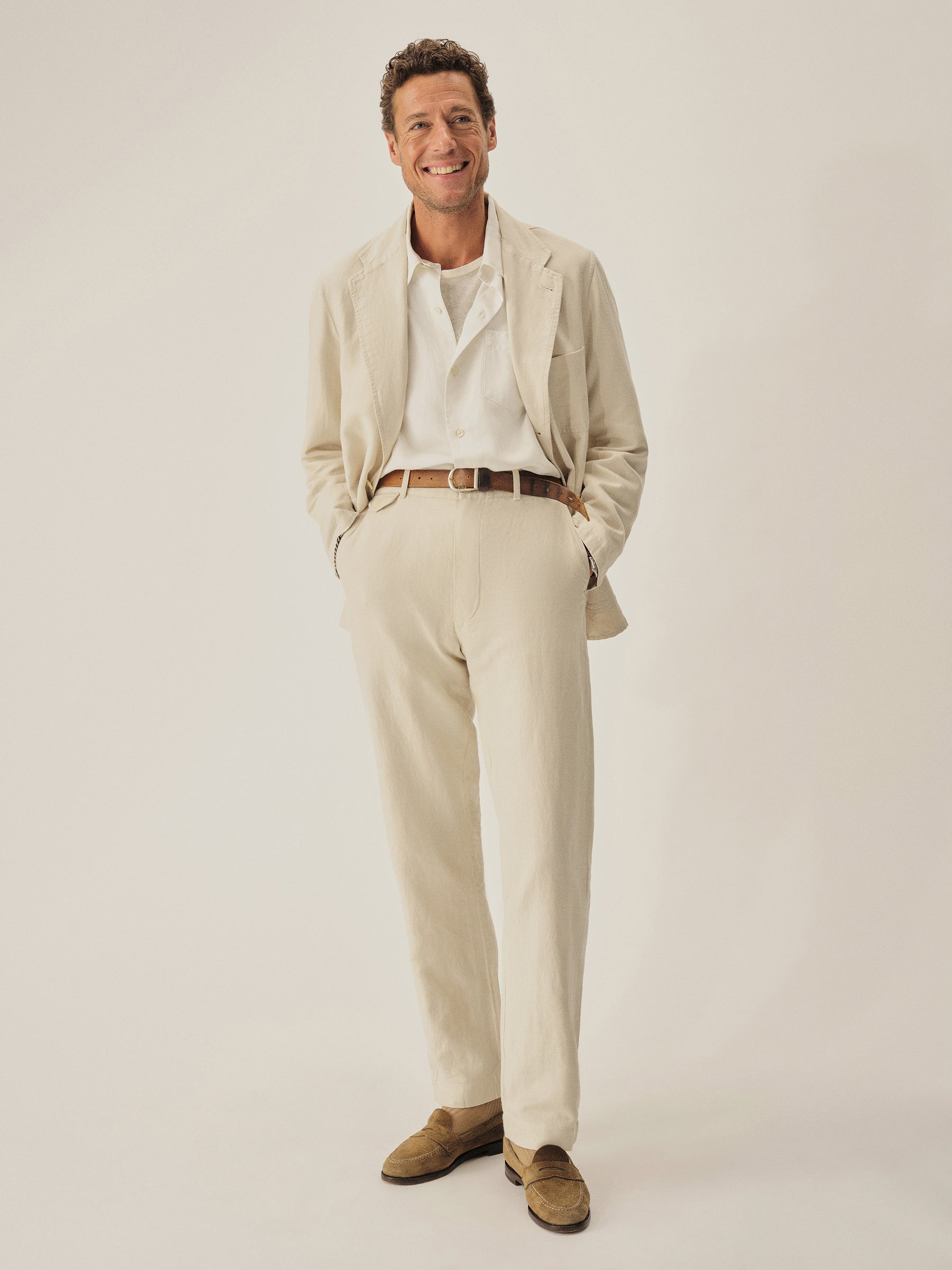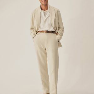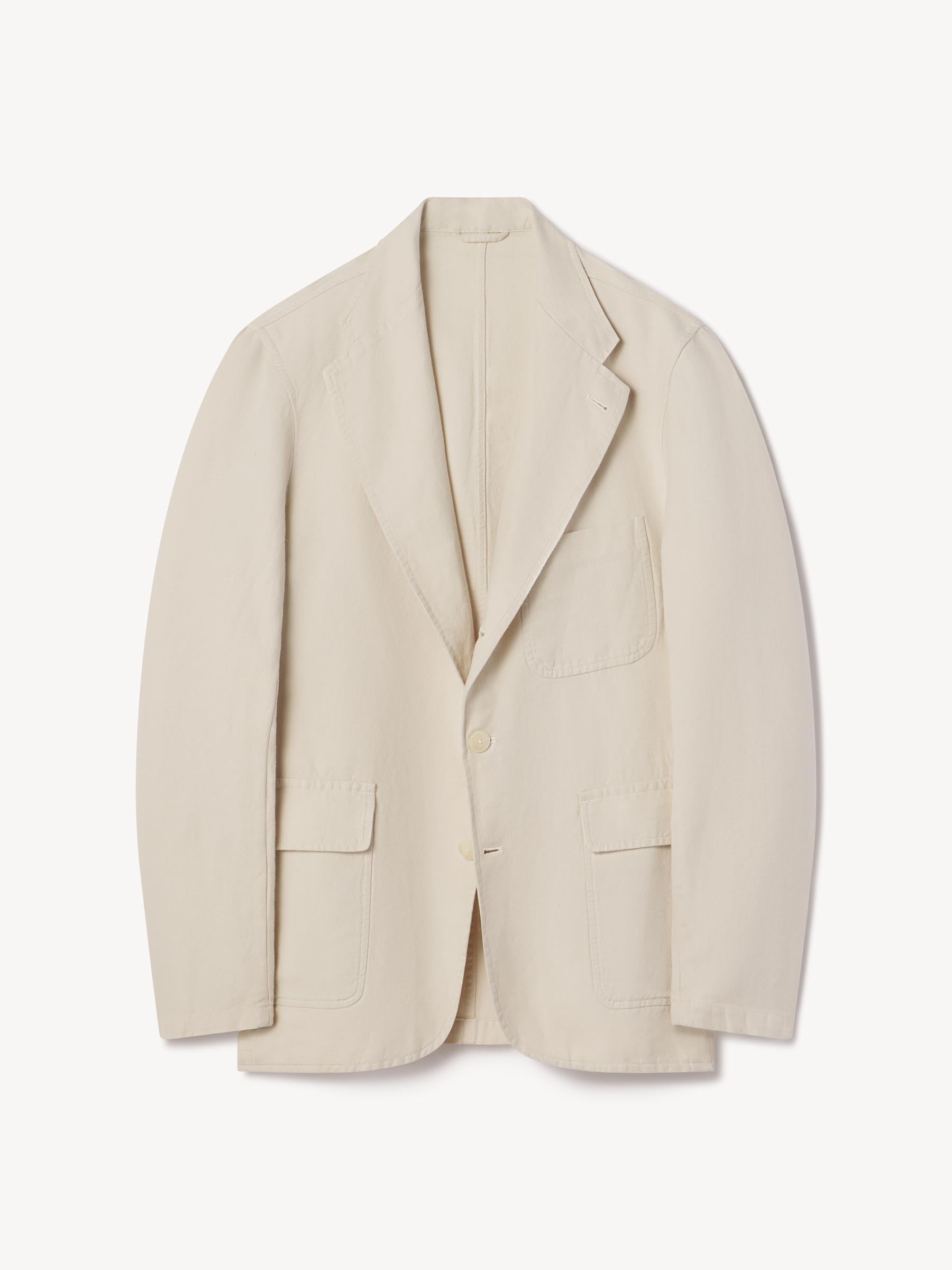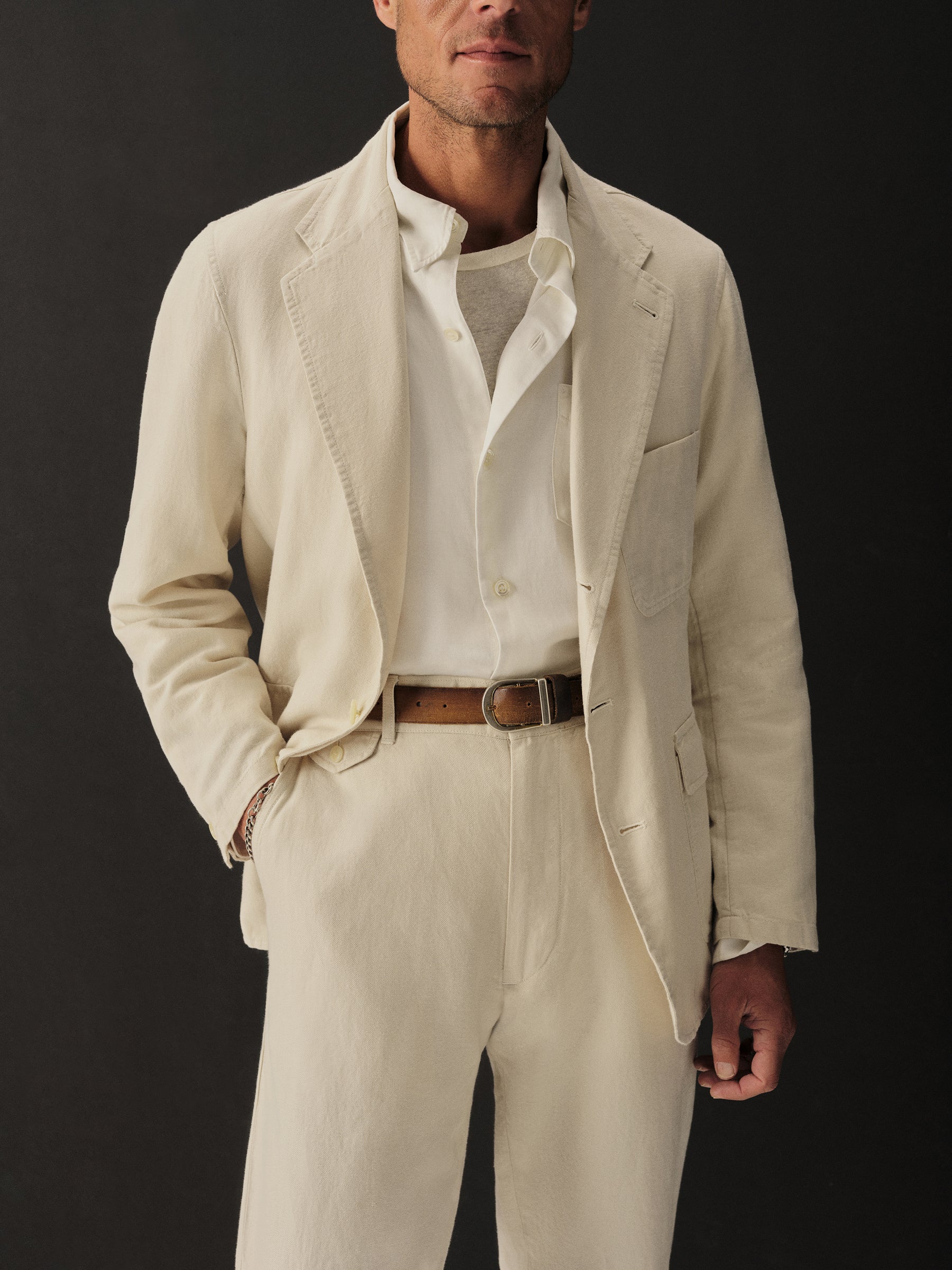 The Carry On Jacket is designed to be casual enough to wear by itself or step up into a full suit with matching trousers. It’s constructed with a classic three-roll, two-button stance with a welt chest pocket and two patch-and-flap pockets at the hip. With no lining or back vent, the jacket is decidedly casual and streamlined. This iteration is made from a light and breathable blend of cotton and linen with a subtly textured herringbone weave.
