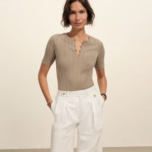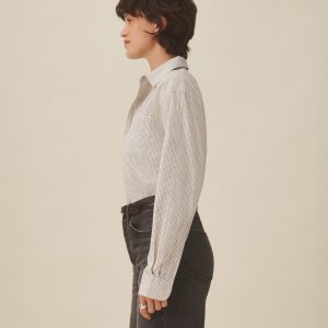 Relaxed-fit sheer shirt made from breathable 80-GSM cotton for a comfortable and airy feel. Featuring shirring at the shoulders and cuffs, a back yoke, and two chest pockets with button closures. Finished with mother of pearl buttons, button-through cuffs, and felled seams. Garment washed for a soft, worn-in feel.