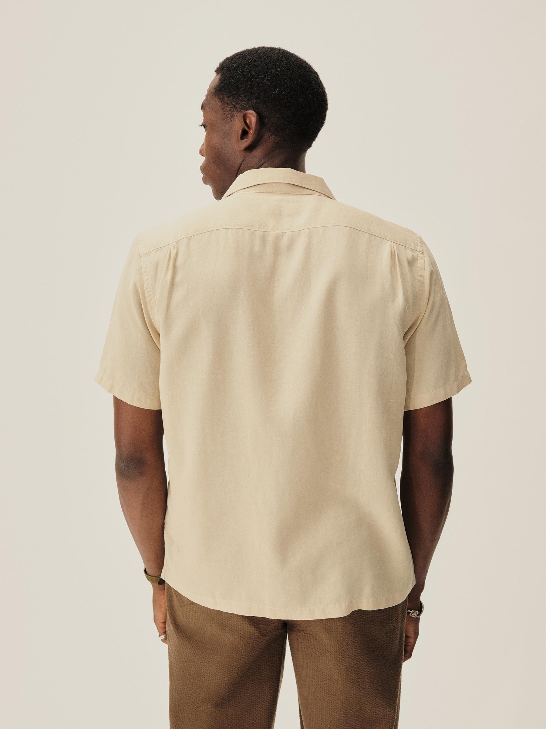 Classic fit short sleeve camp shirt cut from a 5.25 oz. yarn-dyed linen blend with a subtle luster and relaxed drape. Features a six-button placket with mother of pearl buttons, twin patch-and-flap chest pockets, straight hem, and a loop and button closure at the neck. Constructed with clean finished seams. Garment washed with enzymes for a lived-in feel.