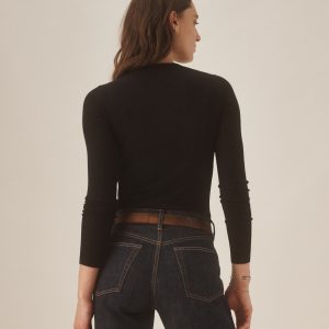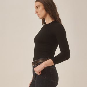 Slim fit crewneck sweater in a 24″” length, elevated in a 14 gauge variegated rib knit from a blend of merino wool, silk, and cashmere. Luxe, easy, and ideal for layering. Constructed with self-starting hem and sleeve trim and fashioning at the neckline and back shoulder for durability.