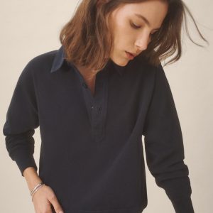 Inspired by the men’s Field-Spec Rugby, the women’s version is cut from 100% cotton in a dense slub jersey with a structured hand. Cut with a cropped, boxy fit and long sleeves, it’s designed with a woven twill collar and placket, tonal poly buttons at the center front, and herringbone-trimmed side slits.
