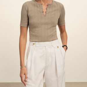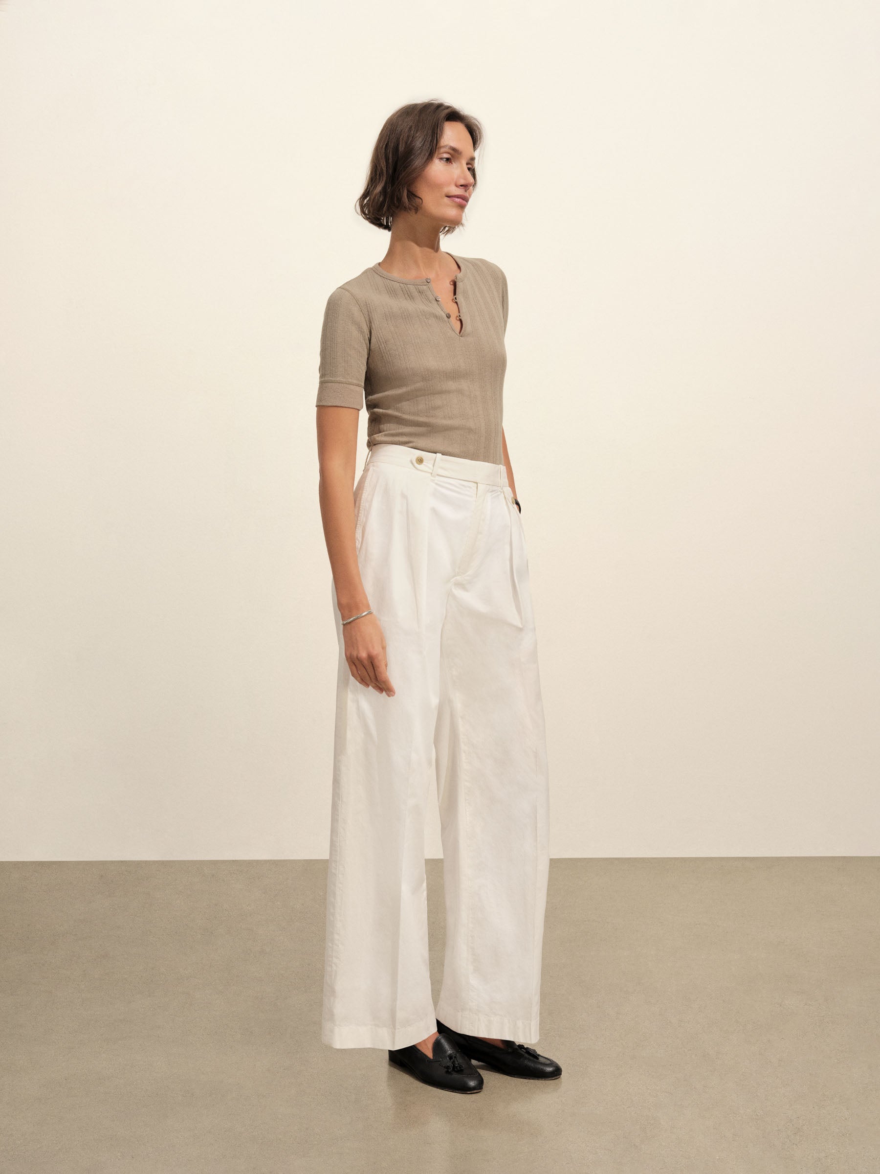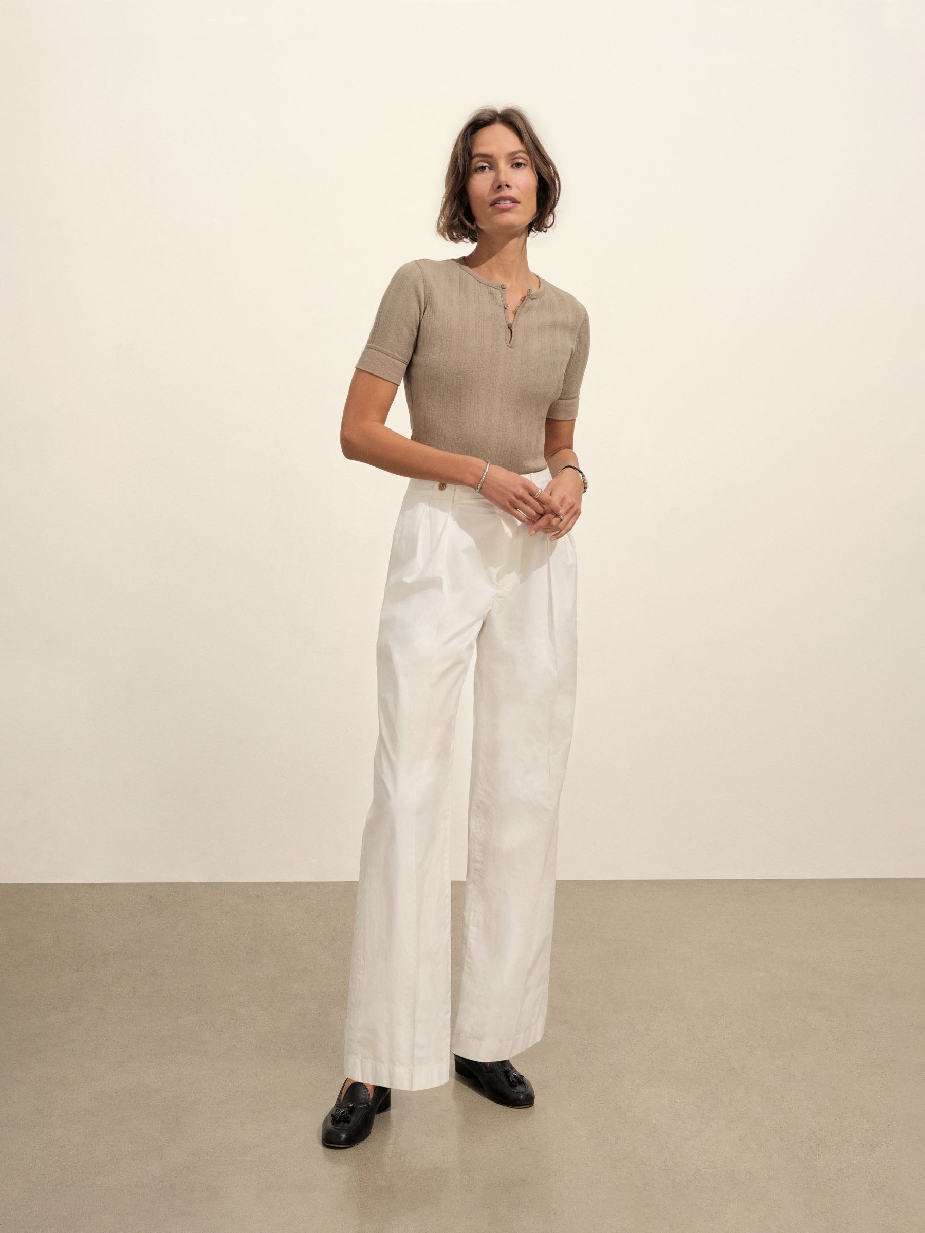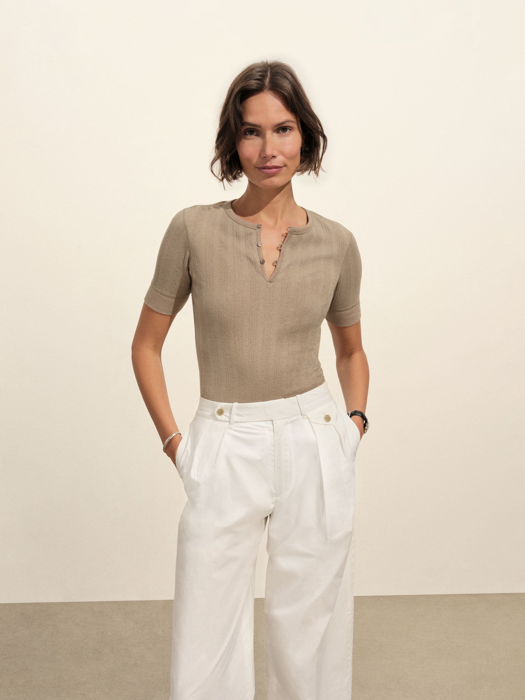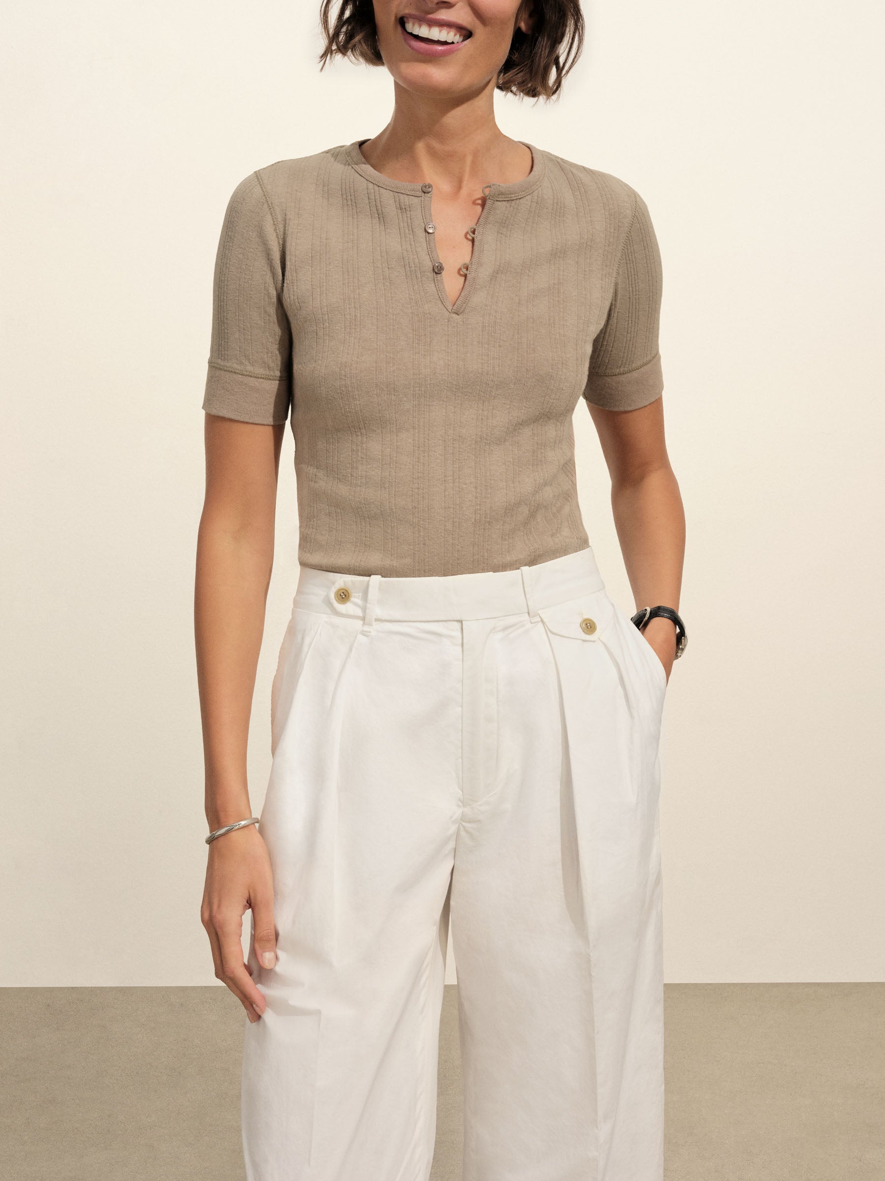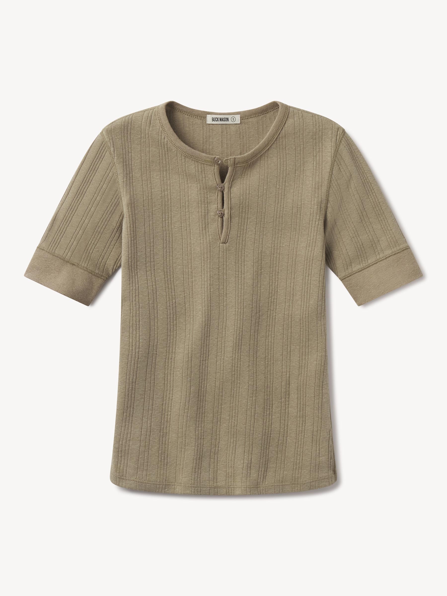 Military-inspired short sleeve henley, crafted from a superfine blend of new and recycled cotton with a subtle, textured rib. Featuring a three-button loop placket and sleeve cuffs. Finished with mother of pearl buttons and garment washed for a lived-in feel.