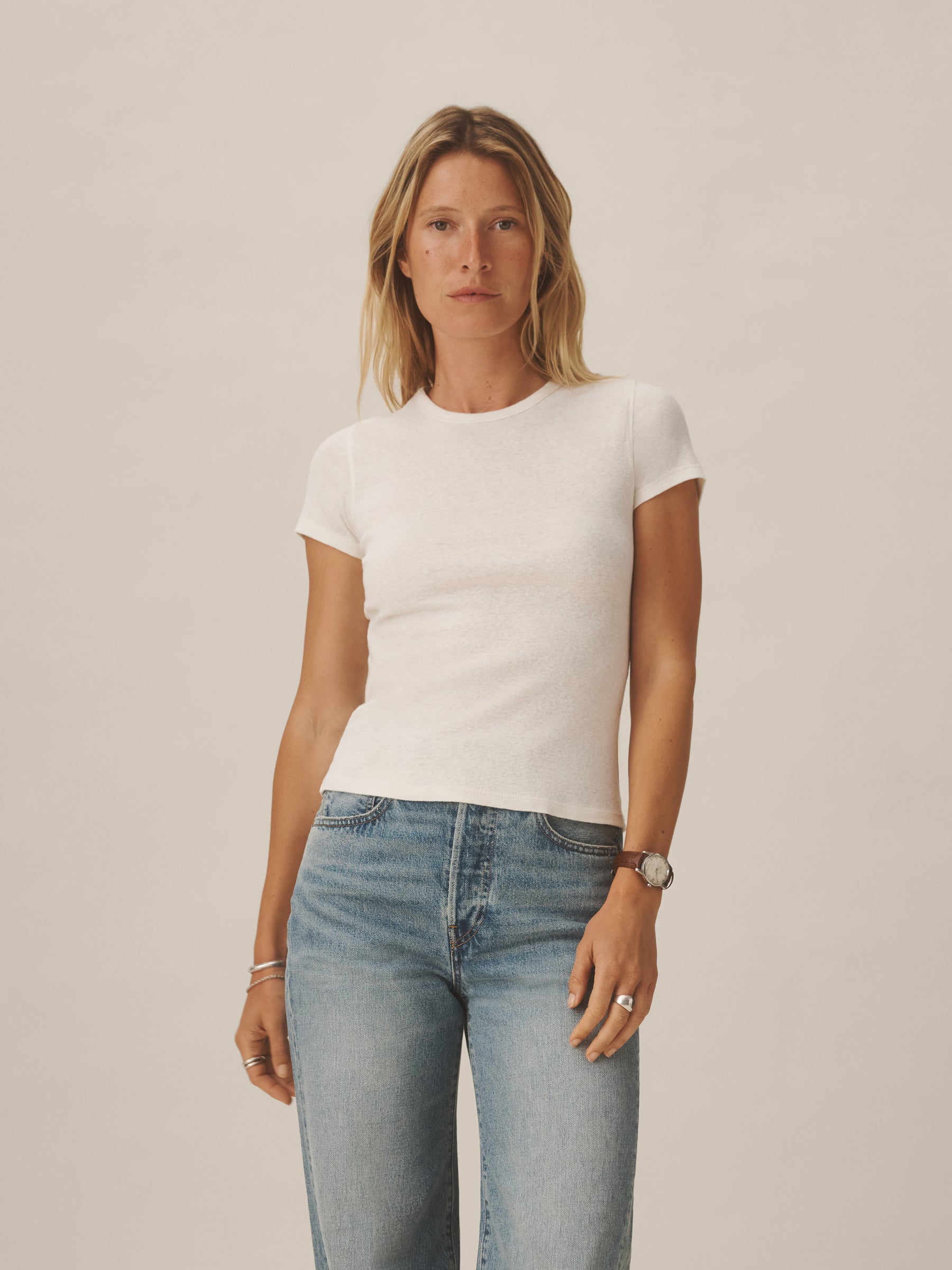 Our take on the classic baby tee, crafted from a superfine blend of new and recycled cotton with a subtle, textured rib. Garment washed for a lived-in look and feel.
