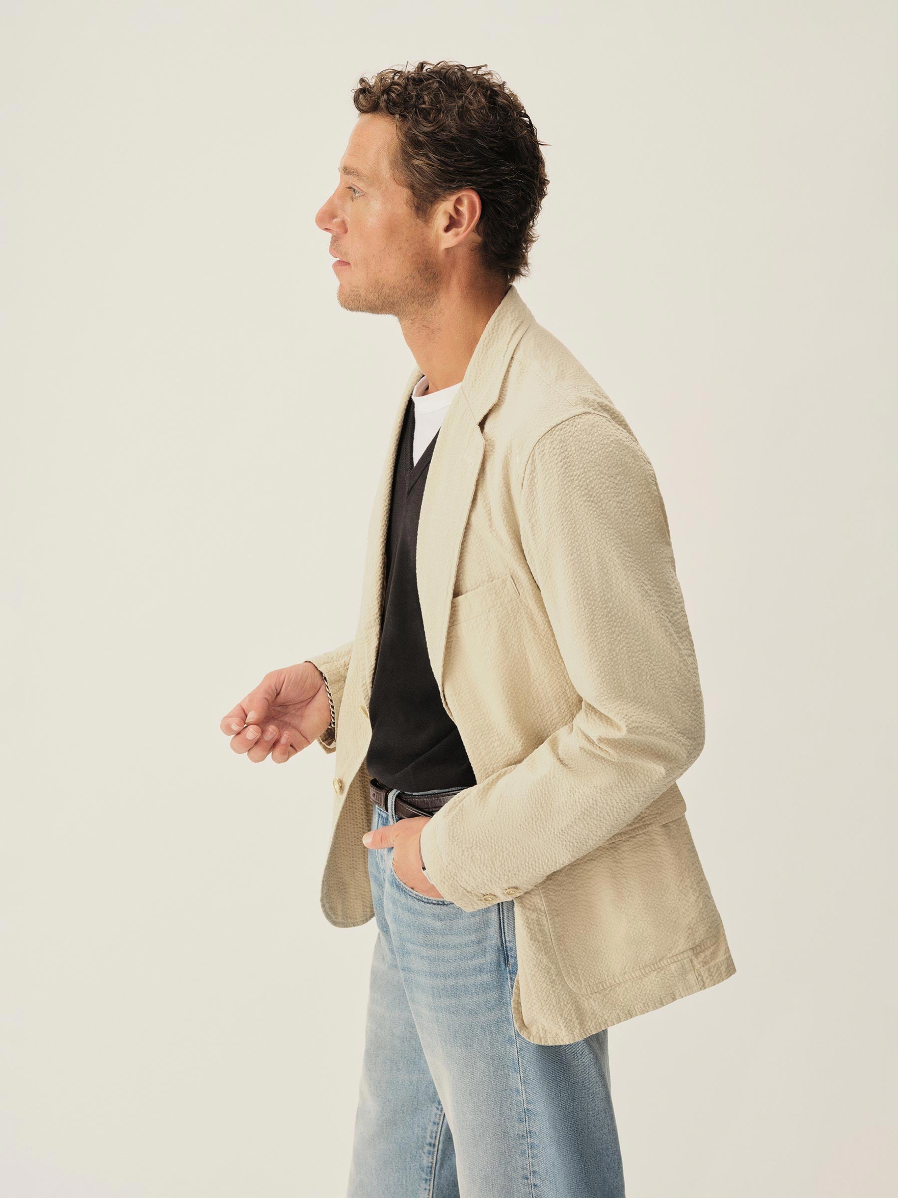 Tailored 3-roll-2 button blazer inspired by timeless vintage suiting. This 5 oz cotton seersucker has a rippled texture that wicks moisture and maintains airflow making it ideal for warmer climates. Details include two patch pockets, two internal welt pockets, and a notched lapel. We left it unlined and omitted the back vent and cuff buttons for a casual, streamlined look. Constructed with hand-linked seams and garment washed with enzymes and softener for a lived-in feel.