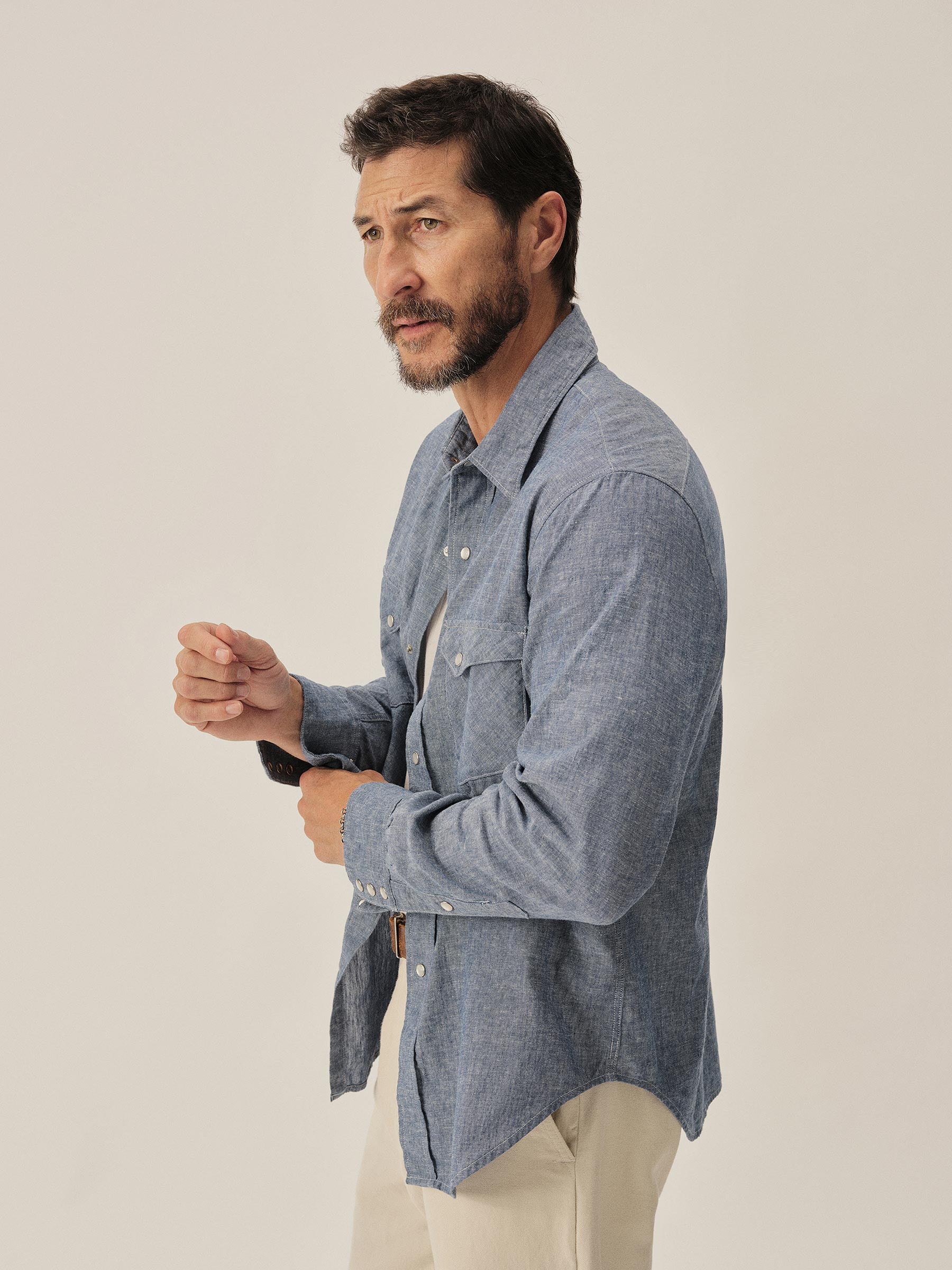 In the style of the 1940s, a classic fit western with no front yokes that lends itself to a more tailored style of dress, cut from a yarn-dyed blend of breezy linen and cotton. Featuring slanted pocket flaps, a pointed back yoke, and snap button fasteners.