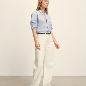 Relaxed button-down shirt in 3.7 oz. cotton plainweave. 29.5” length hits just below the hip. Details include a back yoke with box pleat, a single spade pocket, and pleated cuffs. Inspired by mid-century men’s shirting, this piece can be worn on its own, layered over a tee, or paired with our Rider Pant. Garment washed with softener for a lived-in feel.
