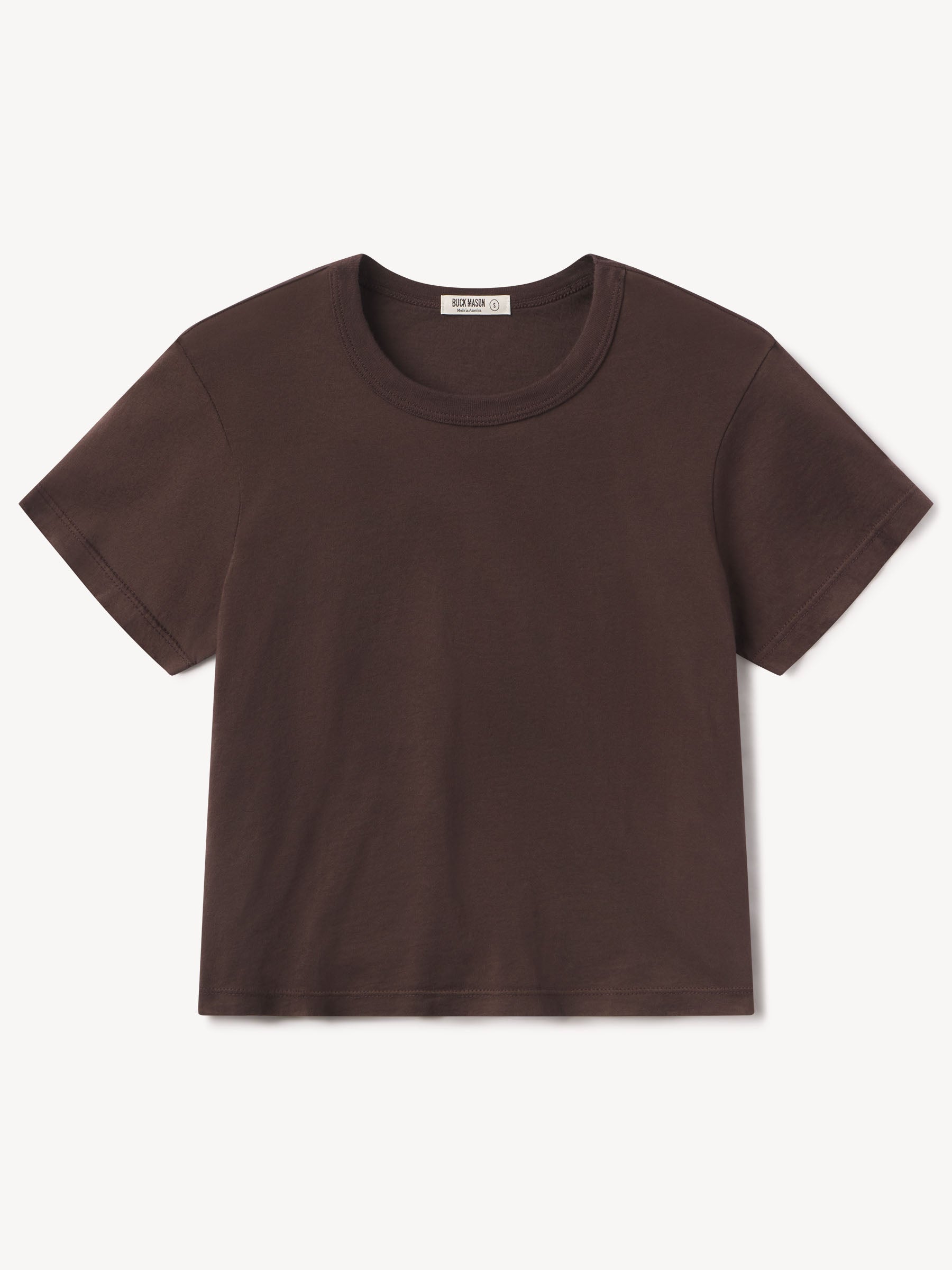 Boxy short sleeve crewneck tee with a straight hem. Cut from 120 GSM Supima cotton. Constructed with rib neck binding and double-needle cover-stitching at the hem. Garment washed for a lived-in feel.