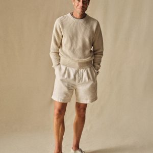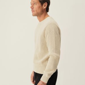 Classic fit crewneck sweater in a homespun textured cotton rib. Constructed with hand-linked seams, double layer ribbing at the collar, and racking stitch detailing at the cuffs.