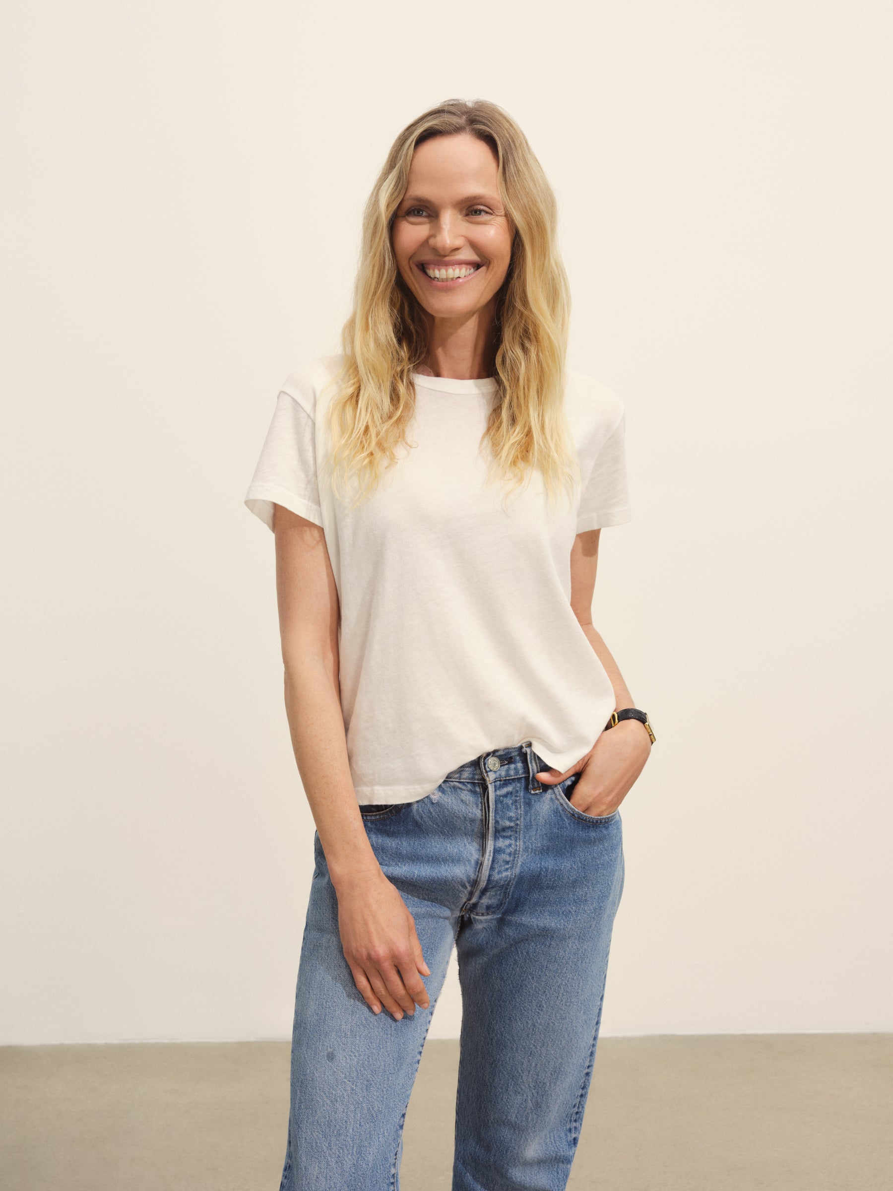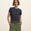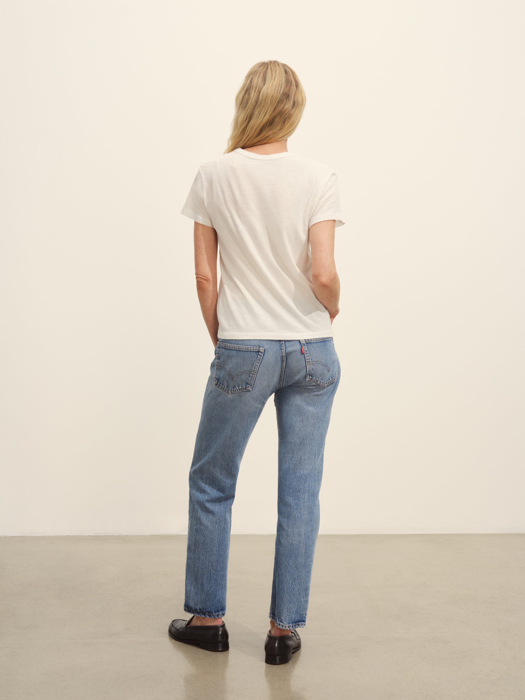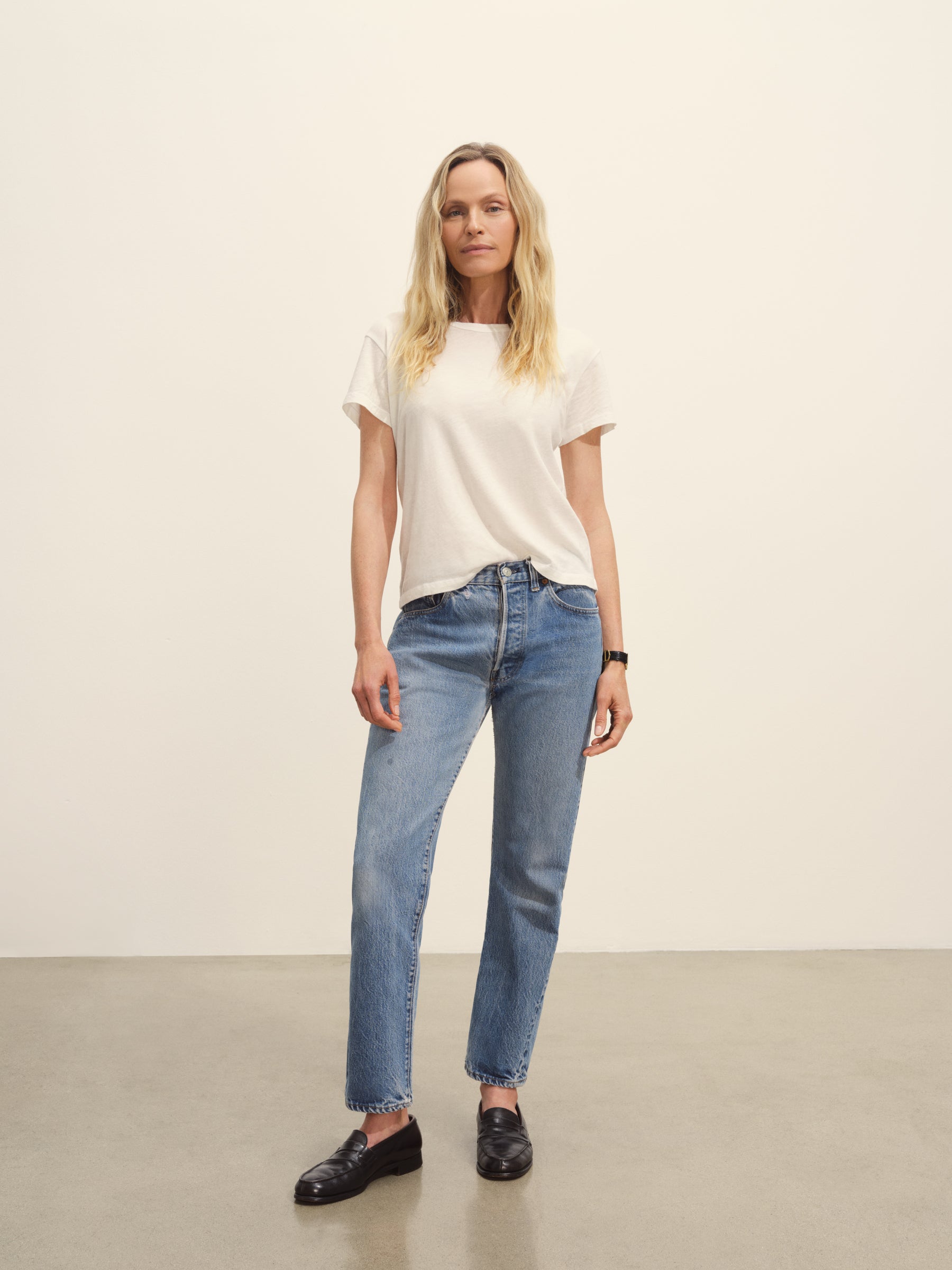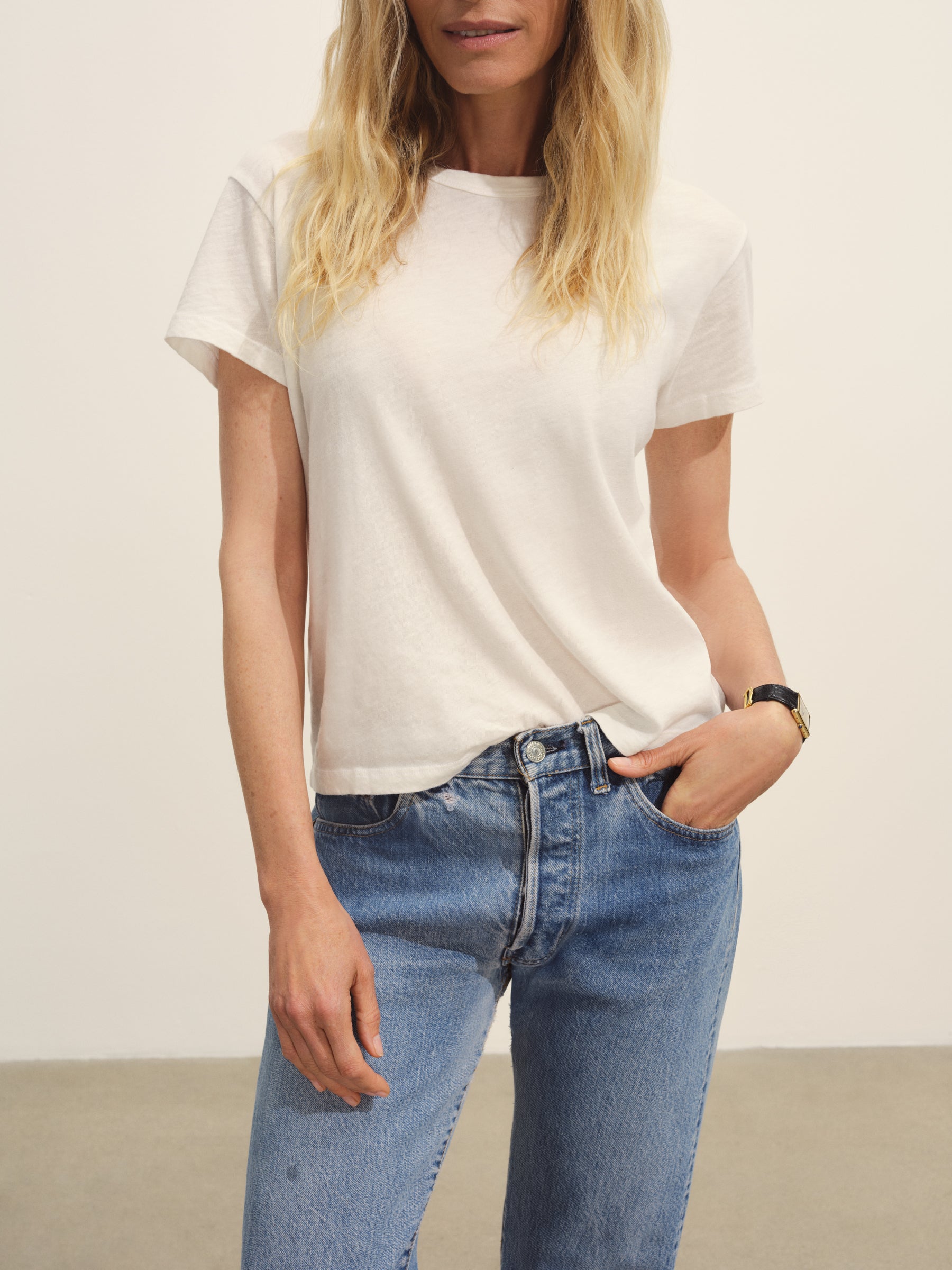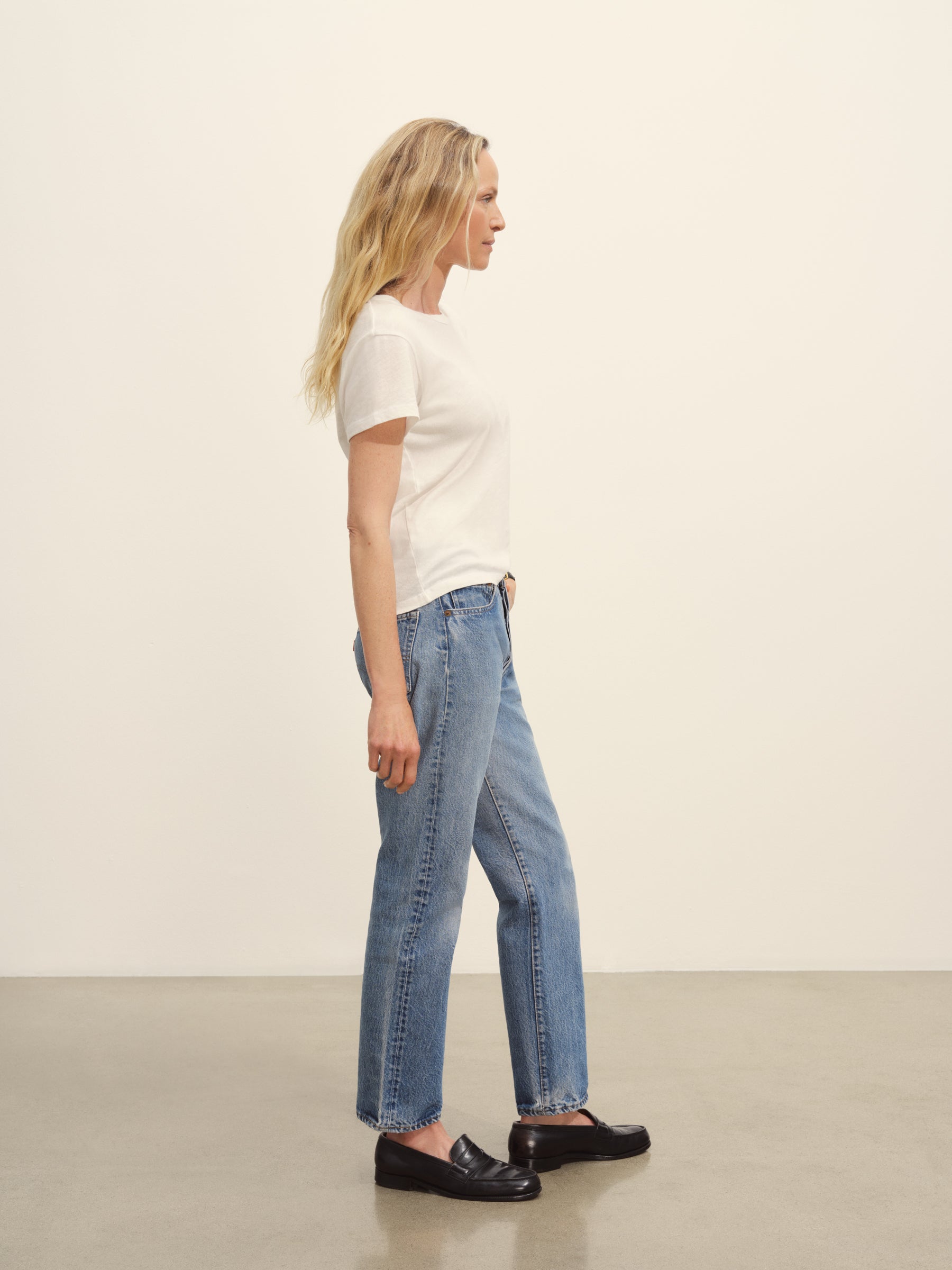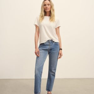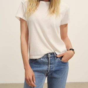 Classic fit short sleeve crewneck tee with a straight hem, cut from 125 GSM cotton with light slub texture. Constructed with self neck binding and ladder stitch detailing at the hems. Garment dyed and washed with softener for a lived in feel.