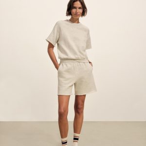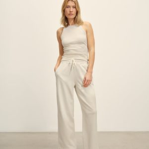 Straight leg, high-waisted 2×2 rib knit pant cut from 295 GSM stretch cotton that holds it shape. Fits comfortably at the waist with a wide elastic waistband with a full length inseam measuring 31 3/4”. Garment washed for a lived-in feel.