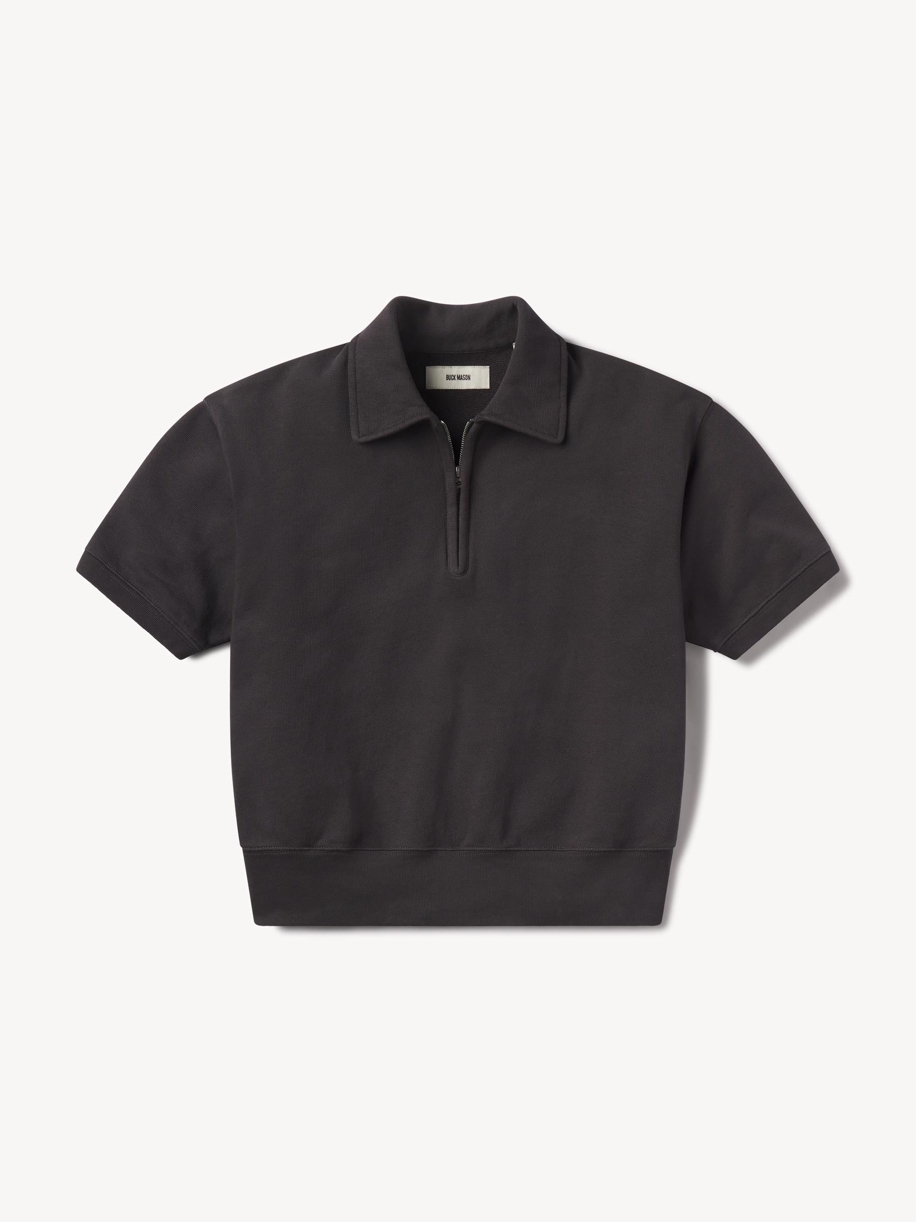 Oversized, quarter-zip sweatshirt that sits below the waist. Features an off-shoulder fit with rib-banded cuffs and hem.